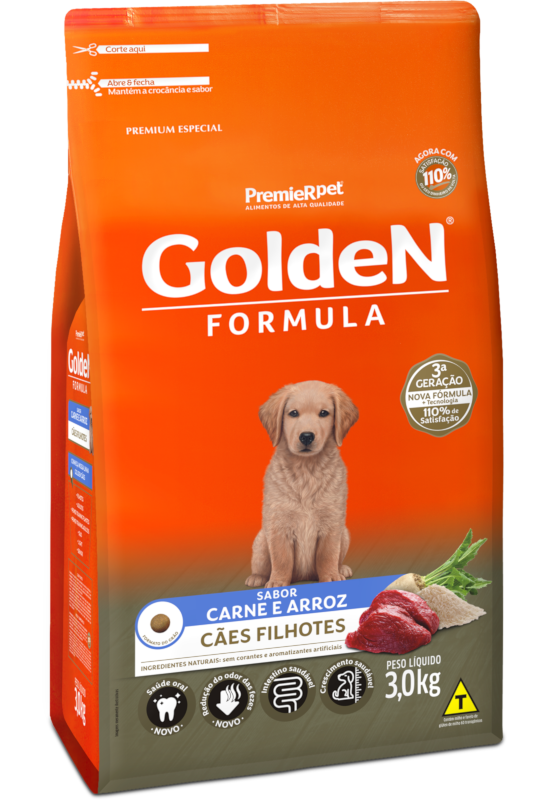 Os cães são essencialmente carnívoros e digerem melhor alimentos de origem animal. Dessa forma, GoldeN® Formula Filhotes Carne & Arroz utiliza proteína de carne bovina de verdade e não sabores artificiais. GoldeN® Formula Filhotes Carne & Arroz é um alimento Premium Especial completo e visa, acima de tudo, proporcionar aos cães o nível ideal de todos os nutrientes que eles necessitam para um crescimento forte e saudável. 3kg – Sistema de Fechamento – Easy open / Abre Fecha e 15kg.